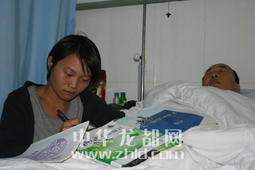 韓金霞趁父親睡時(shí)在病房學(xué)習(xí)