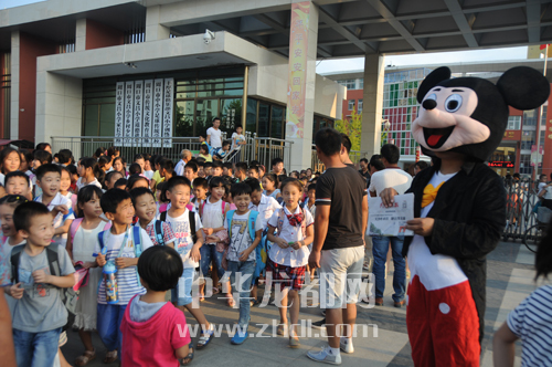 ????9月1日17時許,在慶豐路周口市文昌小學(xué)門前,家長們看到周口晚報(bào)工作人員在派發(fā)禮品,紛紛掏出手機(jī),掃描二維碼關(guān)注周口晚報(bào)微信公眾號(圖一)。17時40分,放學(xué)的孩子們排著整齊的隊(duì)伍陸續(xù)走出校門。校門外,由周口晚報(bào)記者扮演的米老鼠和唐老鴨“大玩偶”吸引了孩子們的目光(圖二)。孩子們興奮地同“大玩偶”玩耍起來。有玩的,還能免費(fèi)領(lǐng)取學(xué)習(xí)用品,孩子們大聲召喚家長加入到掃描二維碼關(guān)注周口晚報(bào)微信公眾號的“大軍”中來。市民趙先生說:“我是咱晚報(bào)的忠實(shí)讀者,正準(zhǔn)備訂閱明年的報(bào)紙,還打算讓孩子參加晚報(bào)組織的小記者活動呢!”