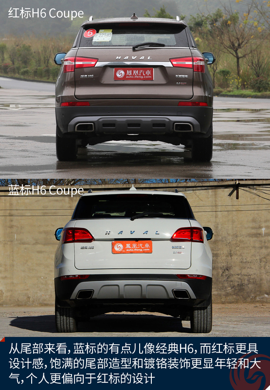從車尾來看,個人認(rèn)為新款的紅標(biāo)好像比藍(lán)標(biāo)更加年輕,可能是設(shè)計(jì)年款導(dǎo)致的,新一些的設(shè)計(jì)更加年輕,當(dāng)然也不失沉穩(wěn),不過藍(lán)標(biāo)的H6 Coupe看起來確實(shí)更具個性。紅標(biāo)更符合大眾的審美。