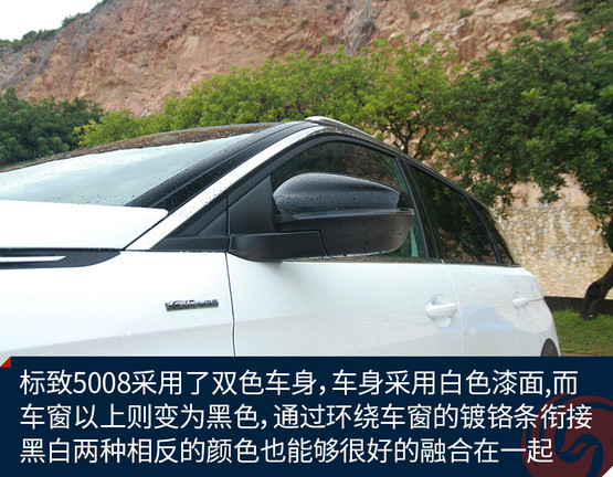 標(biāo)致5008采用了雙色車身,比如我們?cè)囻{的這一輛GT-Line版車型,車身整體采用白色漆面,而車窗以上的部分則變?yōu)楹谏ㄟ^環(huán)繞車窗的鍍鉻條銜接,黑白兩種相反的顏色也能夠很好的融合在一起。