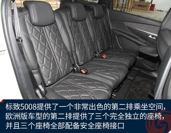 作為一款7座中型SUV,標(biāo)致5008最受關(guān)注的一點(diǎn)就是車內(nèi)空間的體驗(yàn)了,這里我就來多講一講。首先,標(biāo)致5008提供了一個(gè)非常出色的第二排乘坐空間,不夸張的說2840毫米的軸距基本上就是在為第二排乘客服務(wù)的。歐洲版車型的第二排提供了三個(gè)完全獨(dú)立的座椅,并且三個(gè)座椅全部配備安全座椅接口,而國(guó)產(chǎn)車型將會(huì)改為4/6分隔的座椅類型。