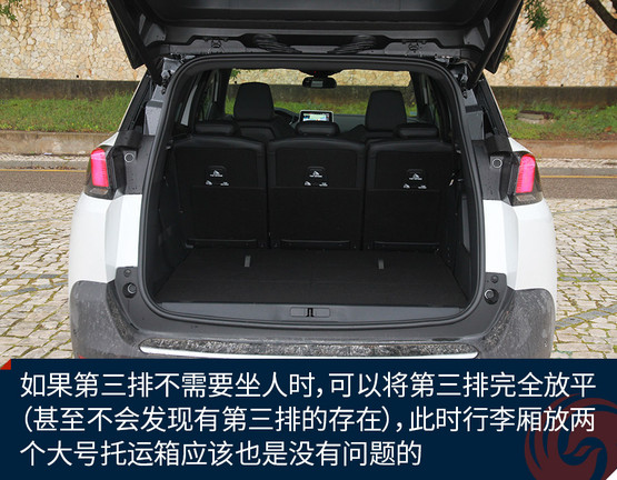 標(biāo)致5008提供了三排座椅還有另外一個(gè)顯著的好處是,可以豐富行李廂的使用方式。通過實(shí)際體驗(yàn)可以發(fā)現(xiàn),當(dāng)三排座椅全部立起時(shí),標(biāo)致5008的行李廂基本能夠放下兩個(gè)登機(jī)箱,但如果第三排不需要坐人時(shí),可以將第三排完全放平(甚至不會(huì)發(fā)現(xiàn)有第三排的存在),此時(shí)行李廂放兩個(gè)大號(hào)托運(yùn)箱應(yīng)該也是沒有問題的。