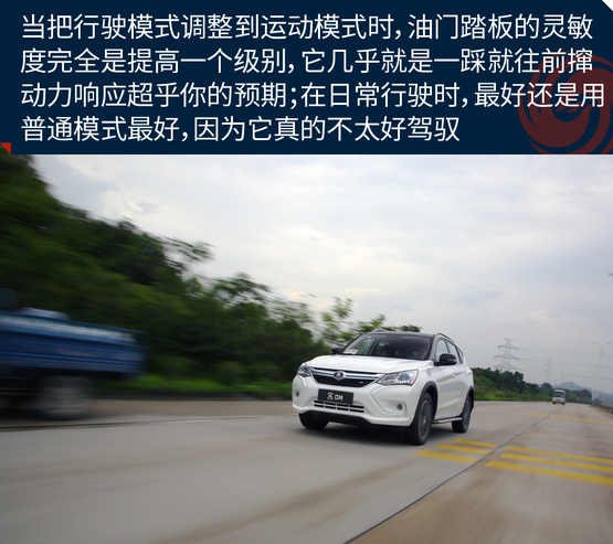 ????????在混合動(dòng)力模式下,將駕駛模式調(diào)整為SPORT模式,由于起步階段是電機(jī)發(fā)力,因此并不像汽油車那樣靠吊轉(zhuǎn)速來獲得最大的扭矩。此時(shí),你只需將油門踩到底,任由宋DM的電機(jī)和發(fā)動(dòng)機(jī)發(fā)力就行,而大扭矩帶來的直接體驗(yàn)就是,身體像是被摁壓在座椅上,任由車輛來讓我體驗(yàn)G值給身體所帶來的快感,而這種“變態(tài)”的加速感體驗(yàn)確實(shí)是非常的過癮;可當(dāng)你還在意猶未盡地回味這速度高潮的時(shí)候,不知不覺就到了該踩剎車的節(jié)點(diǎn)。