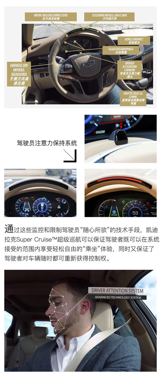 ????????但問題是,當(dāng)一臺車自己好好的行駛在高速公路上,人性驅(qū)使下的駕駛員很容易把注意力轉(zhuǎn)移到其它地方,這就造成了極大的安全隱患。所以凱迪拉克Super Cruise?超級巡航系統(tǒng)最與眾不同的地方,也是讓我覺得最有價(jià)推廣價(jià)值的設(shè)計(jì)理念,是通過駕駛員注意力保持系統(tǒng)與高精度地圖數(shù)據(jù)緊密結(jié)合?,主動監(jiān)測駕駛員的狀態(tài)并做出及時回應(yīng)。這套系統(tǒng)能督促駕駛者始終保持對車輛運(yùn)行狀態(tài)的有效監(jiān)控,這給其釋放雙手的駕駛輔助功能帶來更安全、更自信的使用體驗(yàn)。