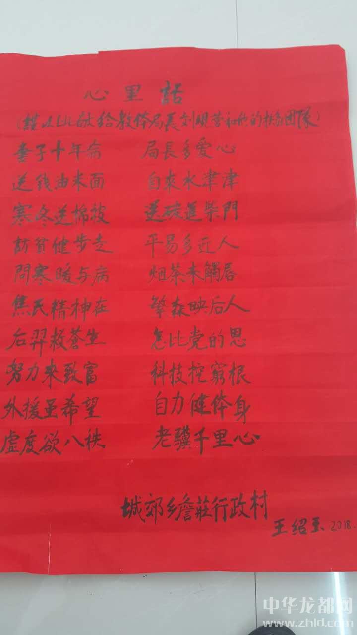“我推敲了幾個(gè)半夜,寫了《心里話——謹(jǐn)以此獻(xiàn)給教體局局長(zhǎng)劉現(xiàn)營(yíng)和他的扶貧團(tuán)隊(duì)》這首五言排律,表表我和老伴及全村對(duì)您的感激之情?!薄捌拮邮瓴?,局長(zhǎng)多愛(ài)心。送錢米油面,自來(lái)水津津。寒冬送棉被,送炭至柴門。訪貧健步走,平易又近人。”王紹玉聲情并茂地朗讀著,劉局長(zhǎng)爽朗地笑了,“老伴劉桂蘭藥按時(shí)吃了嗎?”“按時(shí)吃了,多虧您,到我家宣講扶貧政策,幫助我聯(lián)系有關(guān)單位,我老伴享受了慢性病醫(yī)保。”“桂蘭說(shuō),人家劉局長(zhǎng)隔三差五給咱送米面油,逢年過(guò)節(jié)給咱送慰問(wèn)金,前幾天頂風(fēng)冒雪送來(lái)兩床被子,一年不知來(lái)了多少趟,待咱比親人還親啊!我家也沒(méi)有什么拿出手的,我倆一合計(jì),就發(fā)揮我的一點(diǎn)專長(zhǎng),給您寫了首詩(shī),您經(jīng)常去我家噓寒問(wèn)暖,我今個(gè)也來(lái)您這,算是走走親戚吧,回報(bào)回報(bào)您!”