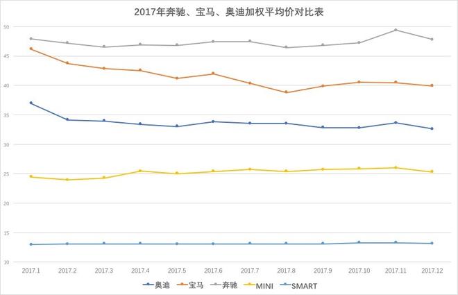2017年全國(guó)社會(huì)消費(fèi)品零售總額中汽車類消費(fèi)總額為42,221.9億元,增長(zhǎng)5.6%;12個(gè)豪華品牌車企,2017年新車銷售營(yíng)收達(dá)到1.1萬(wàn)億,占汽車類消費(fèi)總額的26%;12個(gè)品牌的豪華車銷量以10.77%的市場(chǎng)份額,占26%的汽車消費(fèi)總額,凸顯豪華品牌車企在國(guó)內(nèi)汽車行業(yè)中的重要性。