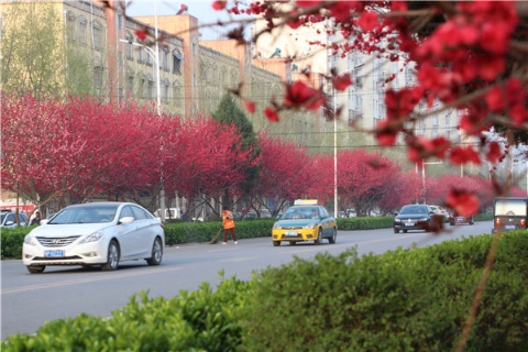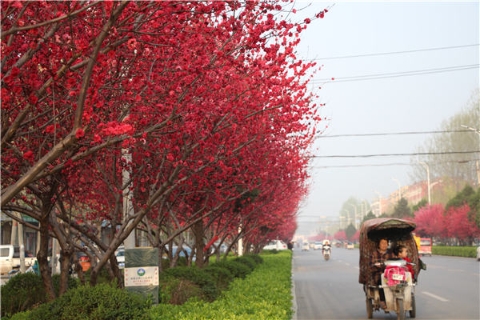 楊樹、垂柳、法桐,這是常見的綠化樹,可是你見過整條道路用桃樹做綠化的嗎?在周口市建設(shè)大道西段,長達1公里的主干道兩側(cè)種滿桃樹?,F(xiàn)在正值陽春三月桃花盛開,整條道路成了一片花的海洋,儼然是鬧市區(qū)里的世外桃源。