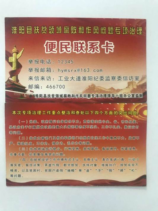 今年4月,淮陽縣扶貧領(lǐng)域腐敗和作風(fēng)問題專項(xiàng)治理全面啟動(dòng)。為確保專項(xiàng)治理取得實(shí)效,縣紀(jì)委監(jiān)委印制發(fā)放“便民聯(lián)系卡”,進(jìn)一步加大宣傳力度,暢通信訪舉報(bào)渠道。他們統(tǒng)一制作的扶貧領(lǐng)域腐敗和作風(fēng)問題專項(xiàng)治理便民聯(lián)系卡,上面印有專項(xiàng)治理工作重點(diǎn)整治和查處的4個(gè)方面內(nèi)容。具體包括黨委、政府履行主體責(zé)任不力,脫貧攻堅(jiān)工作不扎實(shí),敷衍應(yīng)付;扶貧部門及相關(guān)職能部門脫貧攻堅(jiān)工作中不作為、慢作為、亂作為等;扶貧領(lǐng)域發(fā)生貪污侵占,虛報(bào)冒領(lǐng),截留挪用等問題。聯(lián)系卡公布了舉報(bào)電話和來信來訪地址,方便群眾對(duì)黨員干部和部門的監(jiān)督。