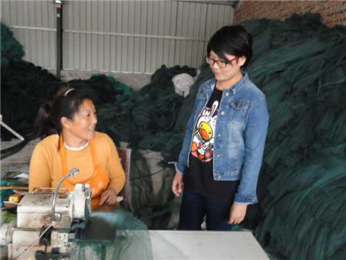 10月18日,商水縣黃寨鎮(zhèn)草樓村的縣人大代表羅林林(右)向留守婦女張大平了解漁網(wǎng)網(wǎng)面生產(chǎn)情況。