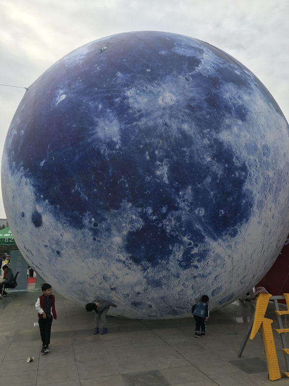 記者在現(xiàn)場(chǎng)看到,這個(gè)“大月亮”塊頭很大,擺放在展廳前。前來(lái)參加展會(huì)的市民紛紛拍照,有的市民還把它發(fā)到微信朋友圈,稱(chēng)“周口有個(gè)超級(jí)大月球”。