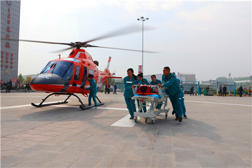 30分鐘后,救援直升機(jī)穩(wěn)穩(wěn)降落太康縣人民醫(yī)院停機(jī)坪,早已在此等候的醫(yī)院醫(yī)護(hù)人員迅速將患者抬下飛機(jī),送往重癥監(jiān)護(hù)室搶救。從接到求救電話到救援結(jié)束,整個過程共用時(shí)30分鐘。