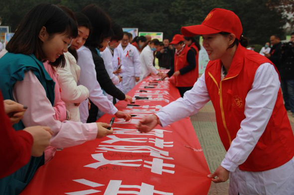 圖為在趕來(lái)參加活動(dòng)的群眾和醫(yī)護(hù)人員共同在預(yù)防艾滋病百米長(zhǎng)卷上簽名。