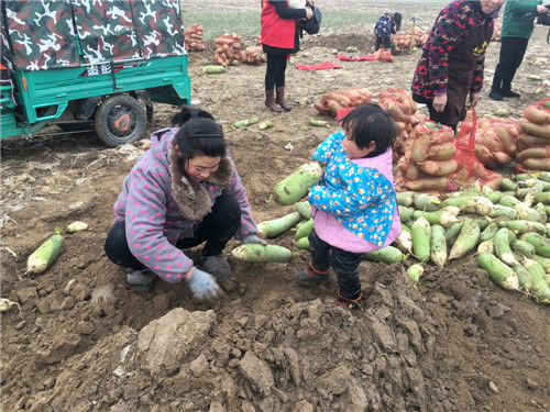 走在淮陽(yáng)縣劉振屯鄉(xiāng)張老家村的田間地頭,記者看見劉玉梅正將蘿卜從地里扒出來(lái)裝車,她的小侄女也幫起忙來(lái),吃力地抱起了一個(gè)大蘿卜。 記者 王凱 攝