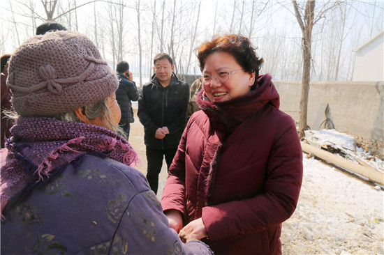 2018年5月11日,張穎波在看望大新鎮(zhèn)陳樓村的困難群眾吳鳳蓮時(shí),曾對(duì)她說過一句話,“等你新房蓋好,我再來看你。”76歲的吳鳳蓮把這句話牢牢地記在了心里。一見張穎波的面,拉著手留著淚連聲說:“俺家房早就蓋好了,就一直盼著恁來。我知道恁忙,可就想讓恁看看俺的房……”老人和一位患病的兒子一起生活,去年5月份張穎波來時(shí),她家正因“危房清零”活動(dòng)而扒掉舊房蓋新房。張穎波當(dāng)時(shí)還特意滿足了老人的一個(gè)愿望,安排村干部為她家房內(nèi)專門壘個(gè)隔斷?!拔遥罚岸嗔?,從來沒住過這么好的房、從來沒過過這么好的日子!”新建的三間磚瓦房、一間配套齊全的廚房和壘好的院墻讓老人感慨不已,發(fā)自肺腑地說著黨和政府的好。“老人家,我今天就是想看看房子改造的怎樣,也給你拜個(gè)早年?!睆埛f波拉著吳鳳蓮老人的手說:“房子蓋好了,也算了了你的一個(gè)心愿,有黨和政府的幫助,日子會(huì)越來越好。你要照顧好自己和孩子,有啥困難就找村里干部。”