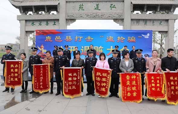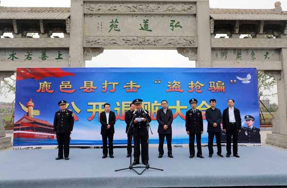 4月25日上午,鹿邑縣召開打擊“盜搶騙”專項(xiàng)行動(dòng)公開退贓大會(huì)。縣委常委、政法委書記侯自峰出席會(huì)議并講話??h公、檢、法、司等有關(guān)部門負(fù)責(zé)人與群眾代表近300人參加退贓大會(huì)。