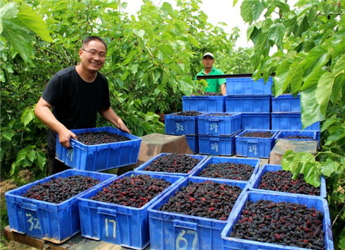 五月,正是桑椹成熟的季節(jié)。在河南益品椹業(yè)有限公司桑椹采摘園里,那鮮紅欲滴、紫黑透亮、又大又甜的桑椹果壓彎了枝頭,一嘟嘟,一串串,甚是好看。