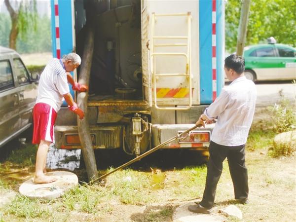 站在公廁旁的污水邊,該負(fù)責(zé)人指揮專門處理糞液的車輛到達(dá)現(xiàn)場(chǎng),并就該公廁的情況向記者進(jìn)行說(shuō)明?!斑@個(gè)公廁是由市園林處負(fù)責(zé)修建的,建好投入使用的時(shí)候就沒(méi)有鋪設(shè)污水管道,只配套了一個(gè)能容納9立方米污水的化糞池。因?yàn)楦浇行V場(chǎng),健身的市民多,公廁使用的頻率高,一個(gè)化糞池不夠用,我們又增加了一個(gè)能夠容納10立方米污水的化糞池,定期進(jìn)行清理?!痹撠?fù)責(zé)人說(shuō)。