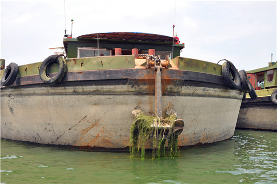 靠近岸邊的是滿載玉米的大船,船上800多噸優(yōu)質玉米是商水一家牧業(yè)公司從江蘇購買的。迎著微微的河風,一條小狗跑到甲板上對著水面上卷起的細細波浪汪汪叫了兩聲,一位60多歲的船民聞聲從船頭住室走到船艙的玉米堆上,察看玉米的干濕度。