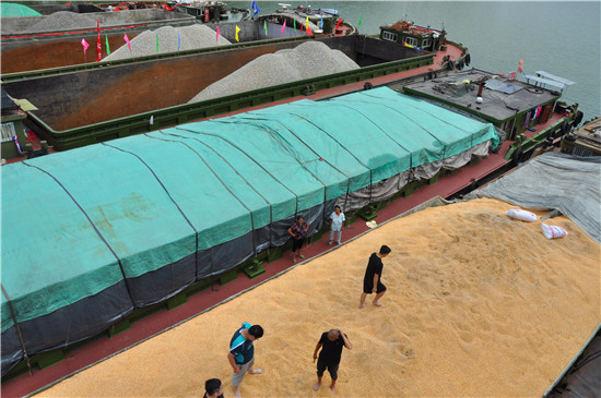 8月8日上午,在碧波蕩漾的商水港區(qū),6條載重上千噸的大船緊靠在一起,一船金燦燦的玉米,兩船褐色的石子,三船白色晶體方解石。站在港口上方遠遠望去,6條貨船像一塊彩條布鑲嵌在綠色的河面上。