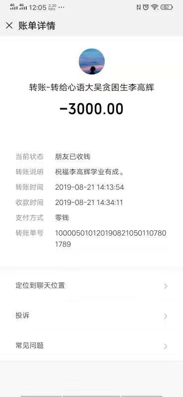 “今后,在學(xué)習(xí)和生活上無(wú)論遇到什么困難,只管給我們說(shuō),我們會(huì)隨時(shí)幫助你解決。”張新靜在與李高輝聊天中再三叮囑李高輝說(shuō)。隨后,他通過(guò)微信給李高輝轉(zhuǎn)來(lái)3000元學(xué)費(fèi)。