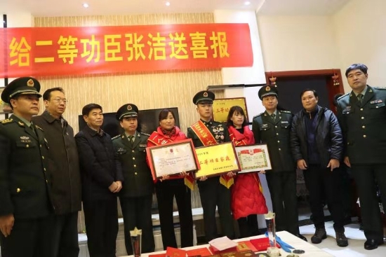 當(dāng)日上午,張潔的老家鑼鼓喧天,熱鬧非常。軍地領(lǐng)導(dǎo)在鄉(xiāng)親們熱烈地掌聲和鑼鼓聲中,帶著滿滿地祝福,專程趕到張潔家中。“張潔同志,在國際軍事比武競賽中取得第一名,榮立二等功為此特向您報喜。希望您今后多與部隊聯(lián)系,多給予張潔同志鼓勵,為實現(xiàn)中華民族偉大復(fù)興的強國夢、強軍夢共同奮斗?!痹趶垵嵓抑?,69246部隊副政委楊富鵬代表組織宣讀了部隊賀信。