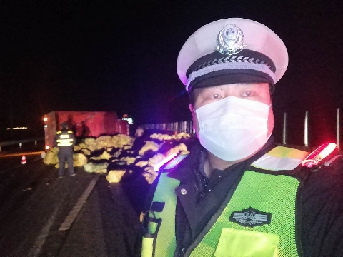 2月15日晚,一輛滿(mǎn)載著蔬菜的大貨車(chē)在大廣高速周口轄區(qū)內(nèi)側(cè)翻,一車(chē)娃娃菜傾倒在高速路上,占據(jù)了兩個(gè)車(chē)道,急需救援。市公安局交通管理支隊(duì)高速二大隊(duì)民警接警后迅速救援,幫助運(yùn)送保障物資的司機(jī)先去送貨,再回來(lái)處理事故。