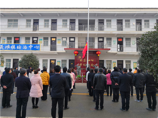 按照疫情防控復產復工工作安排,2月24日為恢復上班的第一天。8時許,西華縣聶堆鎮(zhèn)政府全體干部衣冠莊重、佩戴口罩、按照間隔1.5米的距離整齊地站在國旗臺前共同舉行隆重的升國旗儀式,以一種不一樣的方式打開新的工作局面。