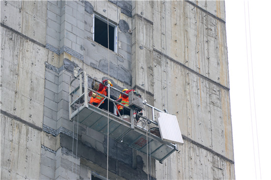 當(dāng)日上午,記者在施工現(xiàn)場看到,樓體外部,工人們隨著升降吊籃的上下正在緊張有序地進(jìn)行外墻保溫施工;樓體內(nèi),工人們正在進(jìn)行內(nèi)墻的粉刷及水泥地板的鋪設(shè),里里外外一派忙碌的景象。