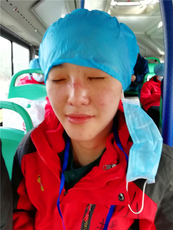 四個小時很快就在緊張忙碌中過去了。接班的新疆醫(yī)療隊護士來了,催促孫慧慧趕緊下班。在密閉的環(huán)境,穿著密不透風的防護服工作,時間長了會胸悶缺氧,“她就一直催我下班”。