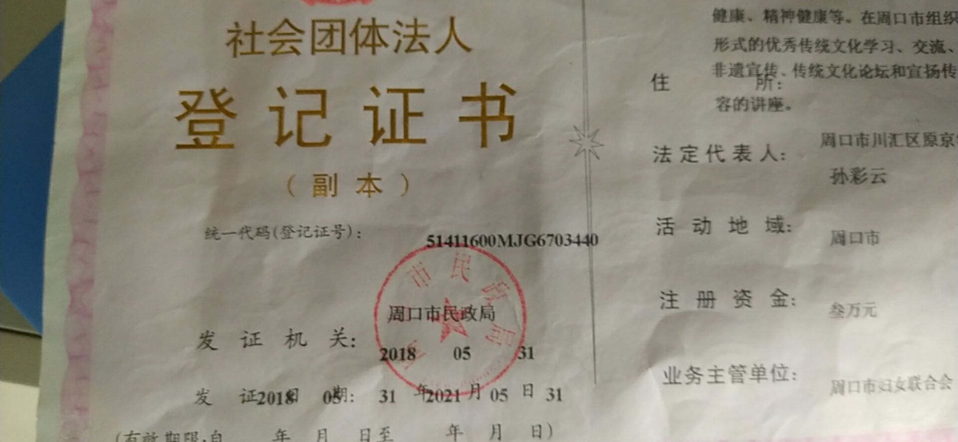 當(dāng)孫彩云把成立志愿者團(tuán)體的想法在微信群里公布后,得到了群友們的積極響應(yīng)。可民間志愿團(tuán)體只有熱情是不夠的,憑著不達(dá)目的誓不罷休的性格,孫彩云一家家尋找掛靠單位,功夫不負(fù)有心人,她的毅力感動(dòng)了周口市婦聯(lián)。在市婦聯(lián)的支持下,2017年4月28日,組織定名“周口市慈孝文化促進(jìn)會(huì)”,同年5月8日,首次護(hù)河行動(dòng)在大鐵牛下舉行,成為守護(hù)母親河的起點(diǎn)。2018年5月31日,周口市民政局批示下發(fā)“社會(huì)團(tuán)體法人登記證書”,慈孝文化促進(jìn)會(huì)正式成為國家注冊社會(huì)組織。