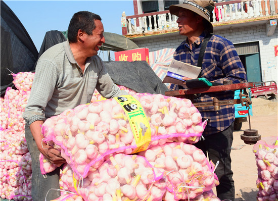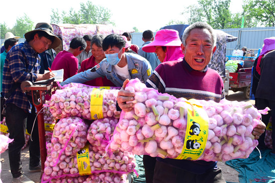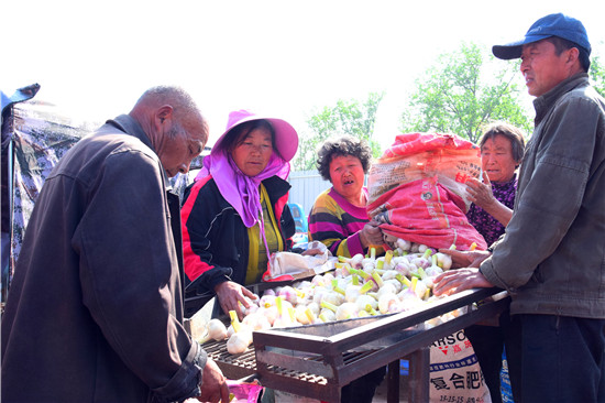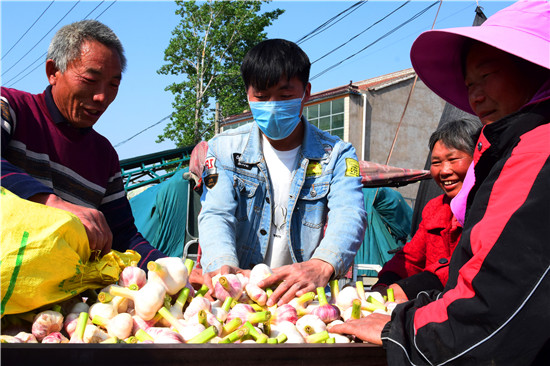 4月26日下午,記者在淮陽縣王店鄉(xiāng)107國道沿線看到,各個大蒜的收購點車來車往,蒜農們拉著新蒜賣給小販們。盡管今年春季雨水較少,天旱土地墑情較差,但是上萬畝大蒜,在蒜農們施肥澆水管理下,長勢不錯,每畝產量在3000斤到4000斤之間,迎來疫情下的大蒜豐收。