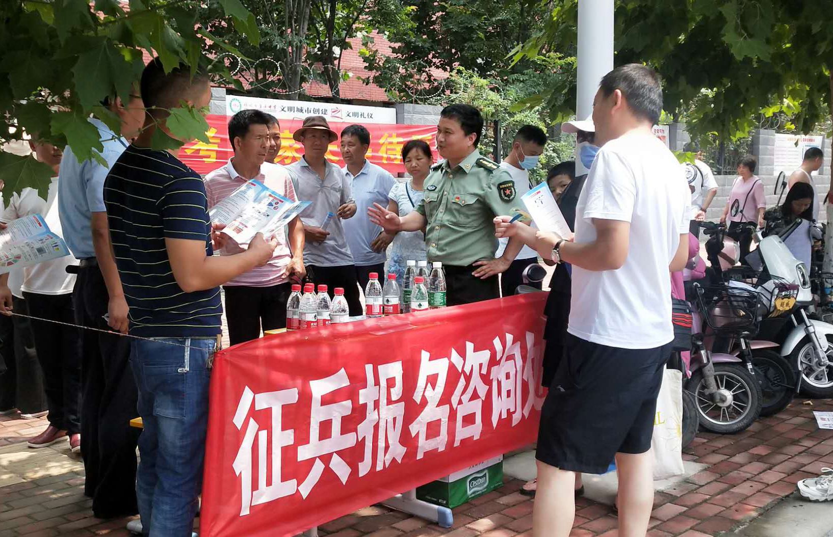 為強化全民依法履行兵役義務(wù)觀念,激發(fā)廣大適齡青年特別是高學(xué)歷青年參軍入伍熱情,7月7日至8日,項城市人武部組織機關(guān)所有人員和21個鎮(zhèn)(街道)辦事處武裝部長等36人,深入各考點設(shè)立征兵政策咨詢點,懸掛宣傳標(biāo)語、擺放宣傳版面,開展以助力高考為目的的大學(xué)生征兵宣傳活動。為不影響考場秩序避免打擾高考,7月7日全天,參加宣傳的工作人員悄悄走進家長等待區(qū),現(xiàn)場向廣大考生家長以及過往群眾發(fā)放《應(yīng)征入伍明白卡》、《大學(xué)生入伍優(yōu)惠政策》等征兵宣傳資料,并接受咨詢。7月8日下午5點30分后,為期兩天的高考結(jié)束后考生放松的走出考場大門之際,所有人員同時守在大門外,一邊給考生發(fā)放宣傳資料,一邊接受學(xué)生咨詢和報名,給他們講解大學(xué)生入伍政策、法規(guī),介紹“應(yīng)征入伍的政治、文化、身體和年齡條件”、“報名程序”、“就業(yè)安置”等相關(guān)內(nèi)容,鼓勵高中畢業(yè)生帶著成績和文化知識投身軍營、報效祖國。