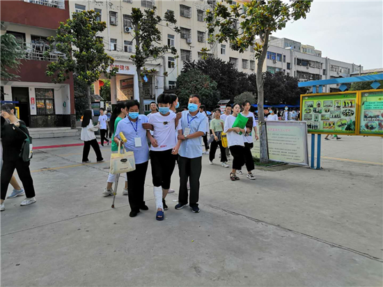 “終于到了,要不是身體好,還真不能一口氣把這孩子背上三樓?!编惓强h第三實驗中學考務老師張子江邊擦汗邊笑著說。