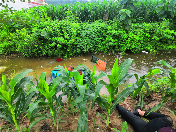 7月26日,連續(xù)多日的降雨已導(dǎo)致農(nóng)村坑滿河平、積水頗深。當(dāng)日下午4時(shí),依然時(shí)雷聲陣陣、雨如豆粒,二人在宜路鎮(zhèn)張寨村小學(xué)附近的玉米田間拍照核查“圖斑”時(shí),看到一輛車箱內(nèi)載有幾位老人的電動(dòng)三輪車冒雨從路邊疾駛過(guò)去。緊接著聽(tīng)到“撲通”一聲,趙文波、李偉二人立即意識(shí)到是三輪車掉進(jìn)路溝、落水了。