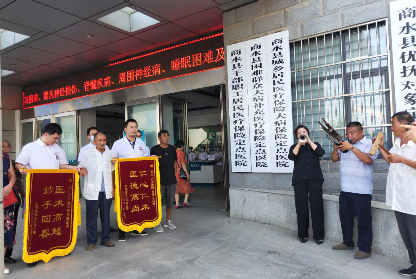 “醫(yī)術(shù)醫(yī)風(fēng)醫(yī)德好,俺給好醫(yī)生送錦旗”,歡快高昂的嗩吶聲響徹周口人合醫(yī)院急診部門前,嗩吶手以歡快的音樂表達(dá)著感激的話語,8月27日上午10時(shí),來自商水縣固墻鎮(zhèn)張莊村的許九德老人帶著家人和一班嗩吶手,來到周口人合醫(yī)院送來錦旗,以農(nóng)民最樸實(shí)的方式表達(dá)自己的謝意。