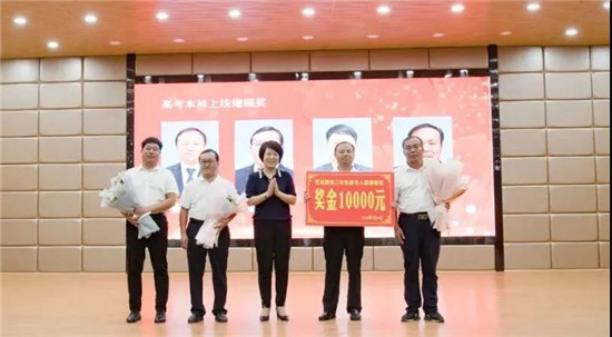與會(huì)領(lǐng)導(dǎo)為40名本科上線增幅獎(jiǎng)、標(biāo)兵教師、新銳獎(jiǎng)、優(yōu)秀學(xué)科組等獲獎(jiǎng)教師代表頒獎(jiǎng)、獻(xiàn)花,并合影留念。