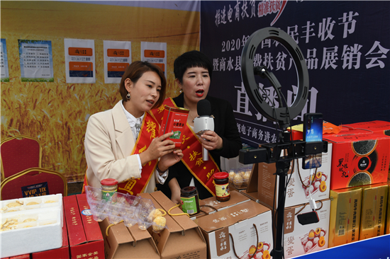 9月22日,兩名“網(wǎng)紅”在商水縣中國農(nóng)民豐收節(jié)暨商水縣消費(fèi)扶貧產(chǎn)品展銷會上進(jìn)行直播銷售。近年來,商水縣大力發(fā)展電商扶貧,出臺政策,幫助農(nóng)民通過網(wǎng)絡(luò)直播等手段把本地的豬蹄、咸鴨蛋、牛肉、變蛋、黑色五谷等特色農(nóng)產(chǎn)品銷往全國各地,打開農(nóng)產(chǎn)品銷售新渠道,為農(nóng)民脫貧致富奔小康增添新動能。