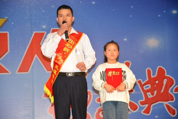 “節(jié)約能手”掘進一隊職工師振東在頒獎臺上接過12歲女兒頒發(fā)的獎杯后,還得到了“小棉襖”的熱情擁抱。
