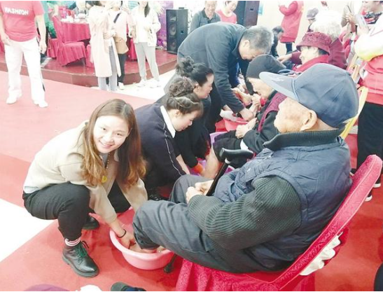 重陽節(jié)當(dāng)天,周口市總工會、周口市教體局、川匯區(qū)供銷社在鴻運酒店舉辦“九九重陽節(jié) 濃濃敬老情”孝老愛親活動,邀請200多名社區(qū)老年人及家屬參加?;顒蝇F(xiàn)場,家屬為老人進行了洗腳(如圖),主辦方安排了精彩的文藝演出,博得觀眾陣陣掌聲,讓社區(qū)老人過了一個歡樂祥和的重陽節(jié)。