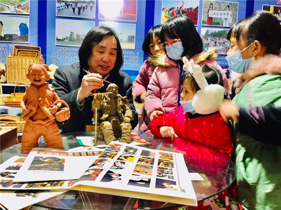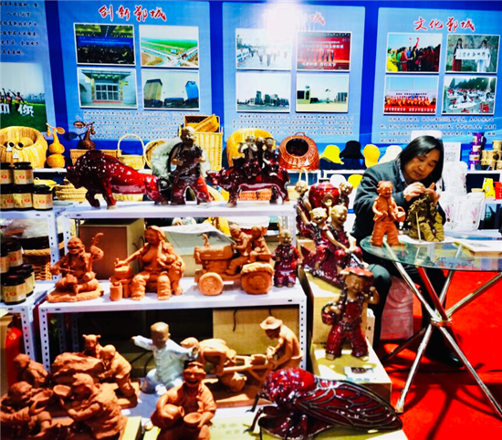 鄲城縣泥塑藝術(shù)大師張振福應(yīng)邀攜48件作品參加大會(huì),成為展會(huì)的一大亮點(diǎn)。其中原生態(tài)泥塑作品18件,有《磨豆汁》《耕耘》《酒逢知己》《二胡曲》等,鈞瓷泥塑作品20件,有《大金蟬》《年年有余》《豫東娃》《瑞牛迎春》等。張振福的作品表現(xiàn)豫東的鄉(xiāng)村人物,作品突出個(gè)性,憨態(tài)可掬,深受觀眾的喜愛(ài),大家紛紛駐足觀看。