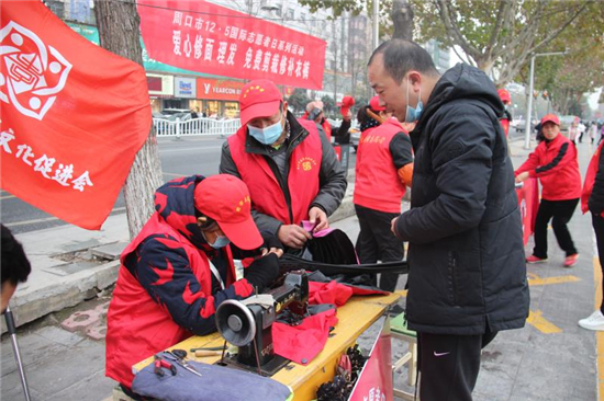 12月6日下午,周口市慈孝文化促進會、周口環(huán)境保護協會的志愿者來到周口中心城區(qū)五一文化廣場開展以愛心剪發(fā)、免費剪裁、修補衣褲為主要內容的便民志愿服務活動。