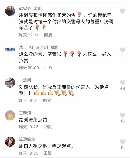 2021年元旦,記者聯系聯系上了視頻中的主人公——沈丘縣交警大隊城市中隊劉濤中隊長,雖然是元旦假日,他依然堅守在崗位上,他告訴記者,這是一名交警工作的日常,沒有想到自己和同事們的一個小舉動能獲得無數網友好評,這給了他們在以后工作中更大的動力,劉濤表示,風雪無阻,滾滾車流中,他將為全縣人民的安全出行繼續(xù)堅守崗位。