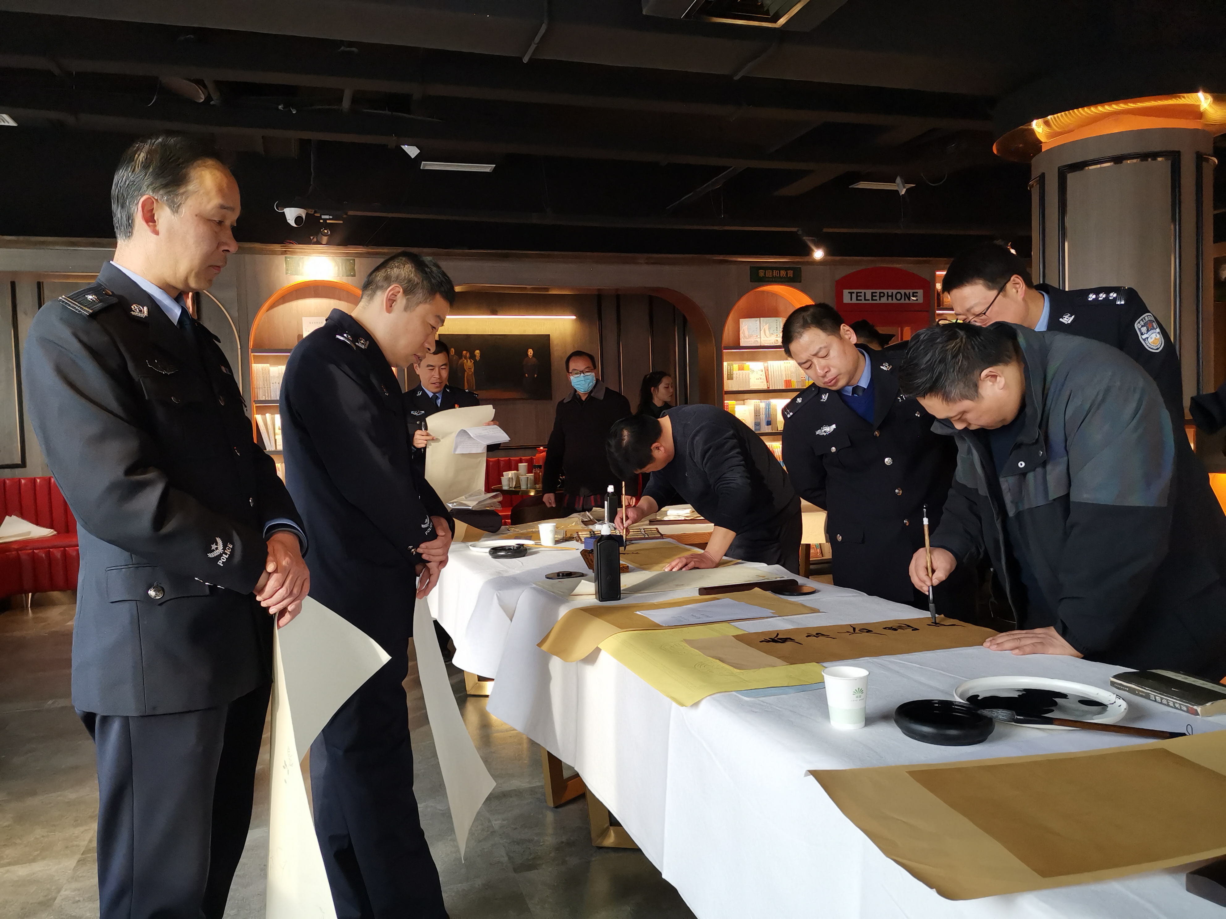 活動現(xiàn)場,氣氛熱烈,書法家們現(xiàn)場揮毫潑墨、筆走龍蛇,帶著喜迎牛年的美好祝愿。民警、輔警爭相圍觀,觀看、揣摩書法家們蒼勁有力的書法作品,房間內(nèi)洋溢著濃郁的節(jié)日氣息。