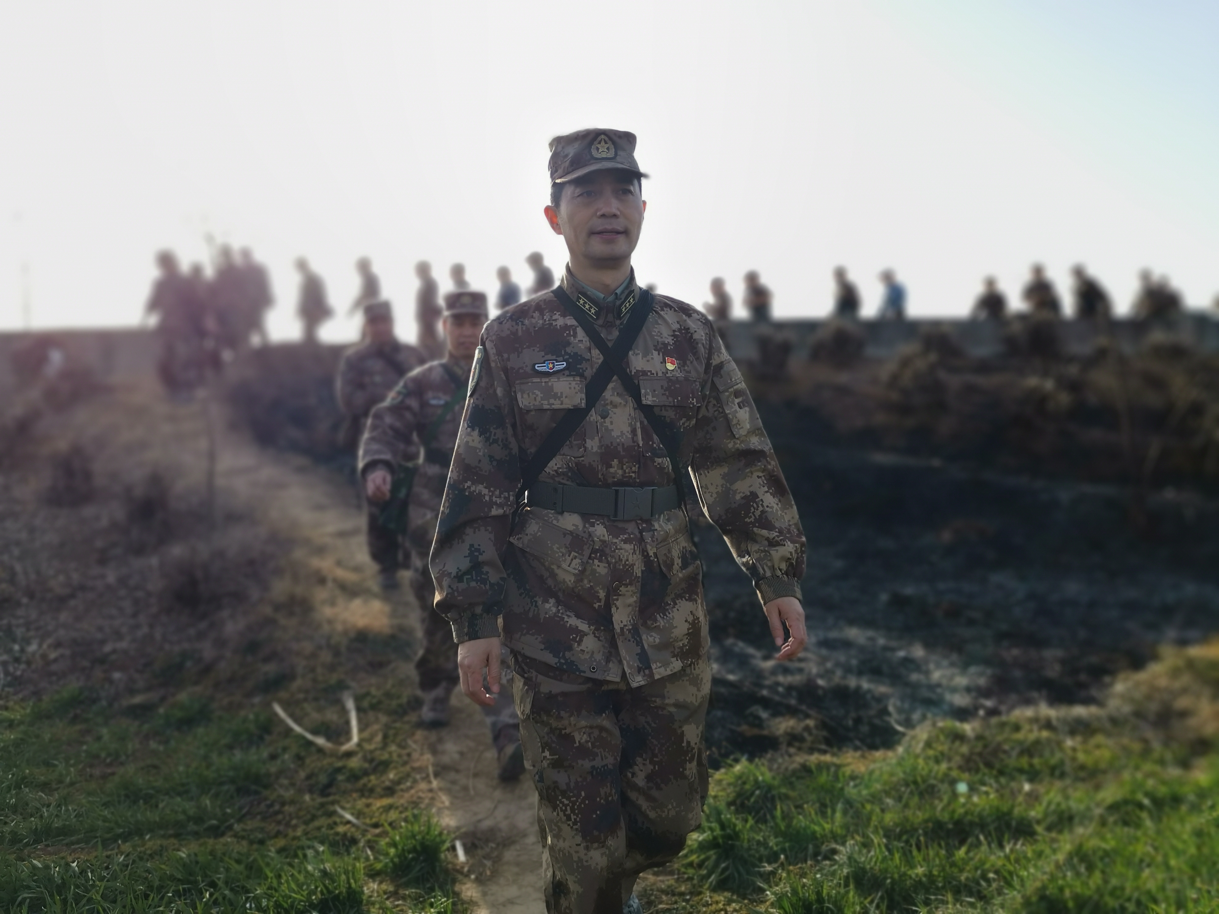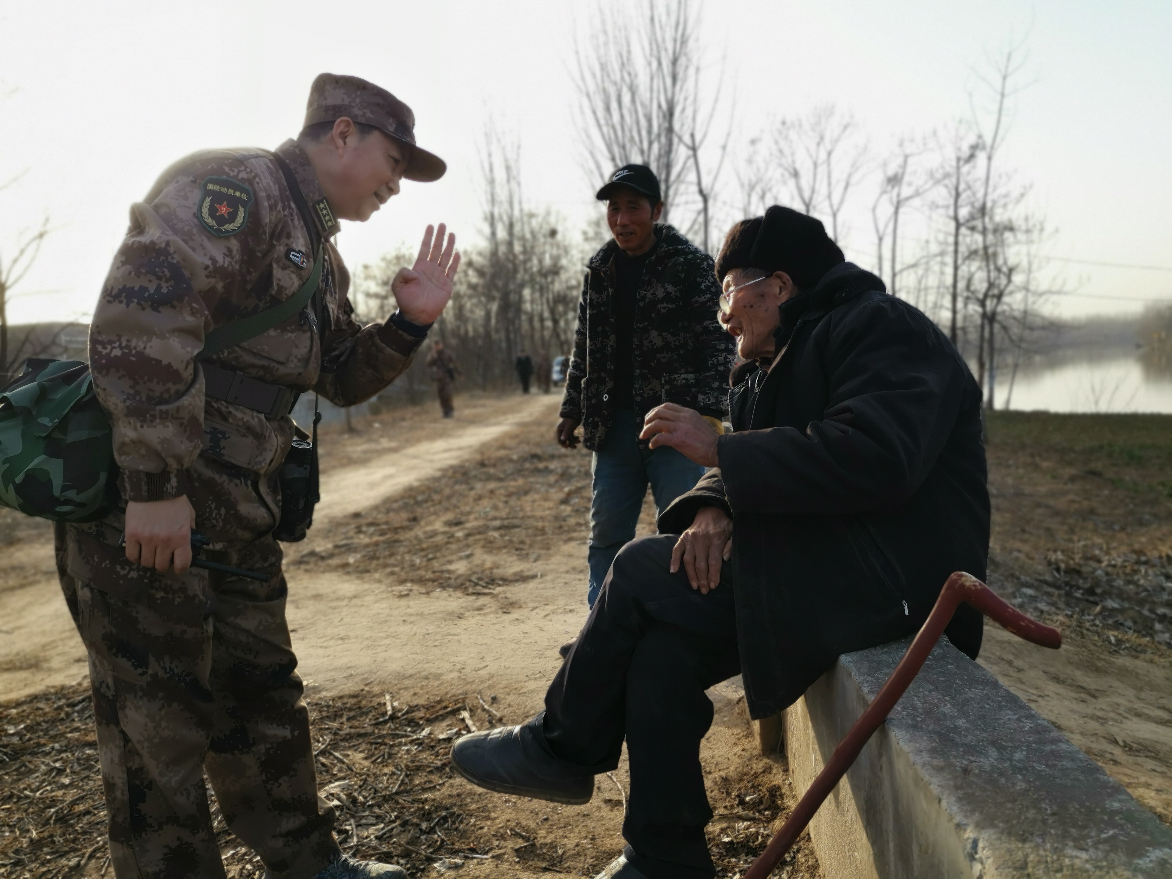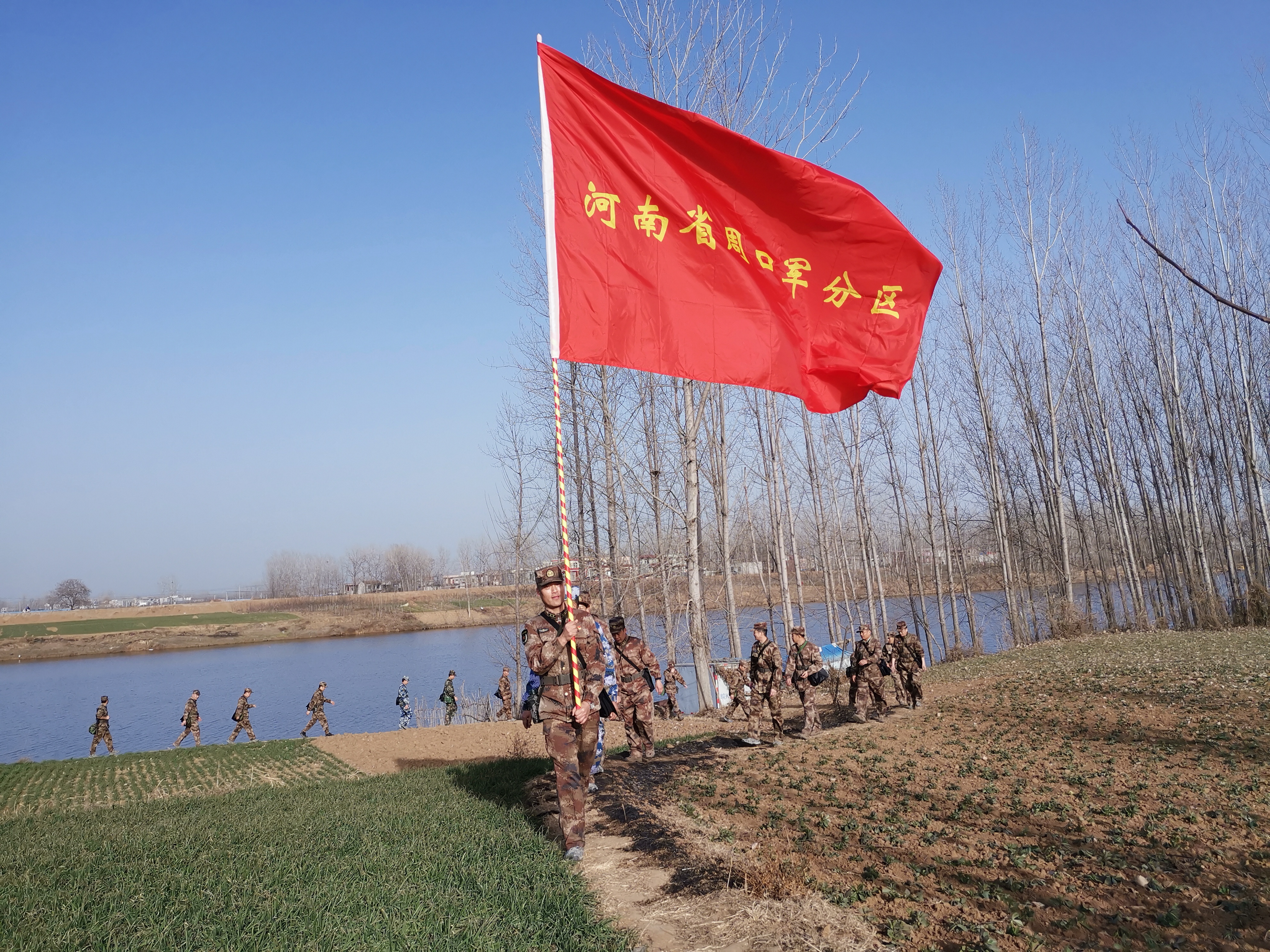 冬日暖陽里,沙潁河畔,一群迷彩身影行走在蜿蜒曲折的沙河堤上。陽光下,“河南省周口軍分區(qū)”的旗幟迎風飄揚。