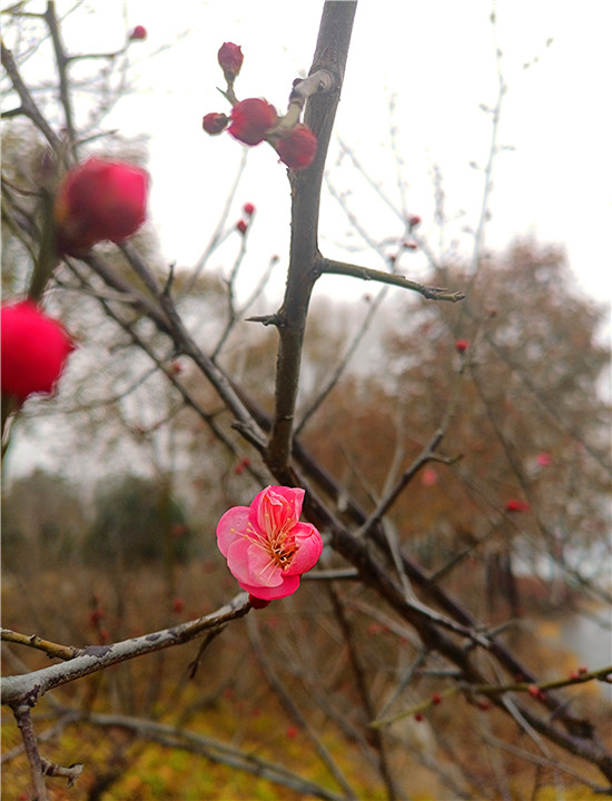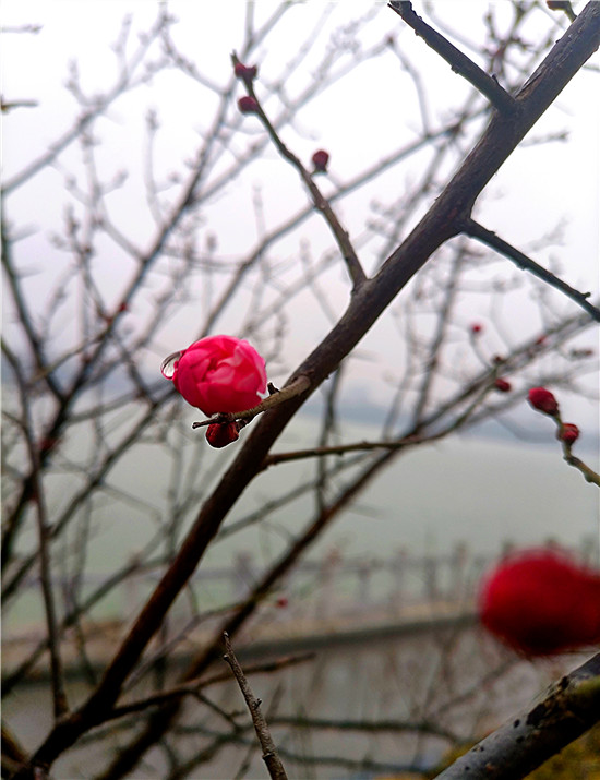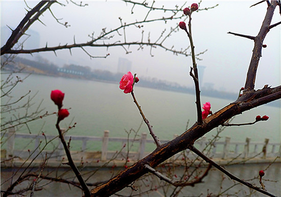 1月25日早晨,我市下了一場(chǎng)小雨。周口公園的梅樹上,幾朵梅花已經(jīng)綻放枝頭,被雨水滋潤(rùn)過(guò)后的梅花嬌艷,凝結(jié)在梅花上的小水珠晶瑩剔透,讓梅花變得別有一番詩(shī)意。