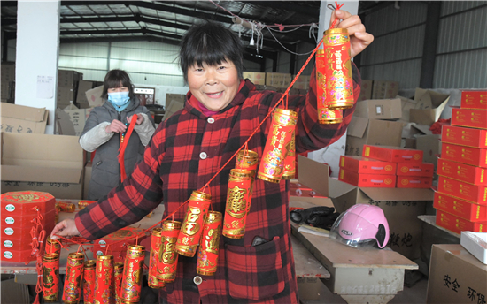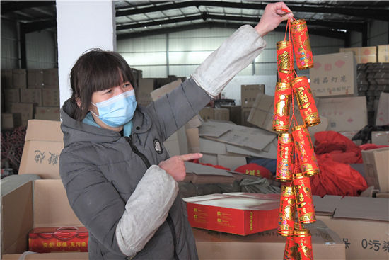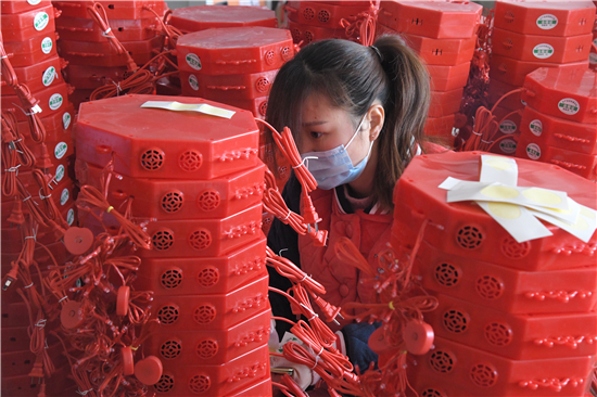 2月2日,在商水縣魏集鎮(zhèn)產(chǎn)業(yè)扶貧基地一帆工藝制作工廠,村民正在生產(chǎn)安全、環(huán)保、無(wú)污染的電子鞭炮。春節(jié)臨近,不能燃放傳統(tǒng)鞭炮的市民非常喜歡這種高科技替代產(chǎn)品,產(chǎn)品供不應(yīng)求。③2
