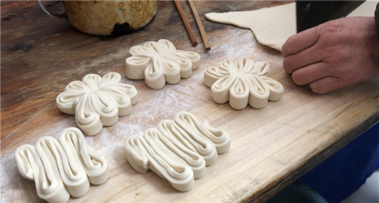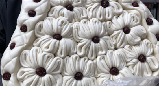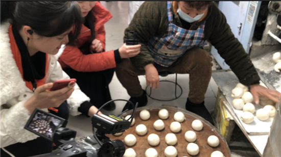 除了平常的白面饅頭,黃師傅還讓妻子現(xiàn)場展示了“棗山”制作,并介紹了棗山的寓意和習(xí)俗?!澳憧催@棗山是一層一層的,寓意著步步登高,而且棗山的花形是圓的,代表著團(tuán)團(tuán)圓圓。過去出嫁的閨女過年回娘家要帶大饃,娘家要回棗山,現(xiàn)在咱們周口的一些地方還保留著這樣的習(xí)俗。”兩位主播體驗(yàn)了棗山的制作過程,得到黃老板妻子的夸獎:“中!這倆妮兒可巧!”