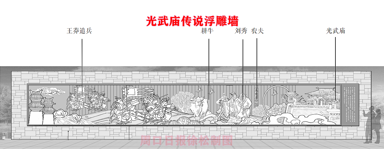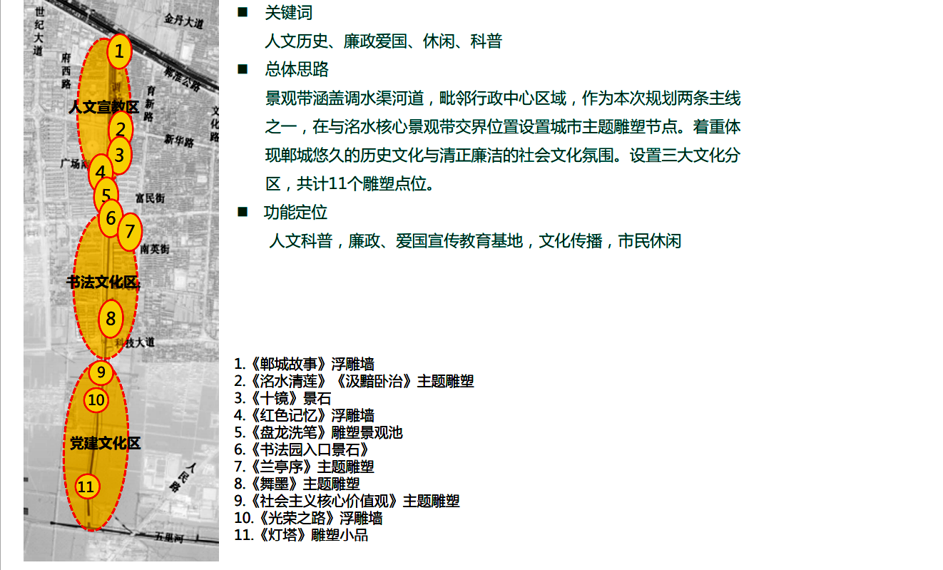 在縣委、縣政府綜合大樓東側的核心形象段,配合鄲城行政中心打造莊嚴、大氣氛圍的同時,對鄲城歷史文化進行了集中展示,包括鄲城的歷史沿革,鄲城的發(fā)展理念,歷史故事等。其中調水渠西側以現(xiàn)有人民廣場對應的綠地為基礎,設置了較多的歷史文化節(jié)點。如調水渠新華路橋頭北側的廉政文化廣場,講述了漢朝名臣汲黯的故事。汲黯為人耿直,直諫廷諍,親政愛民,敢于承擔責任,漢武帝劉徹稱其為“社稷之臣”。汲黯廉政廣場建設在此處更有著深遠的意義,它一方面提醒老百姓要了解歷史、敬畏先賢,同時也激勵著鄲城縣的各級黨員干部要在習近平新時代中國特色社會主義思想引領下,“不忘初心、牢記使命、廉潔奉公、一心為民”。