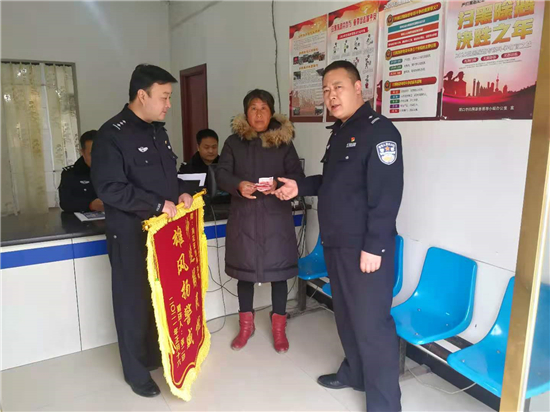 2月27日上午,一名群眾將寫著“神速解民憂 雄風(fēng)揚警威”錦旗送到川匯公安分局荷花路派出所民警手中,感謝民警們的辛苦付出。錦旗背后的故事還得從一條抖音說起。