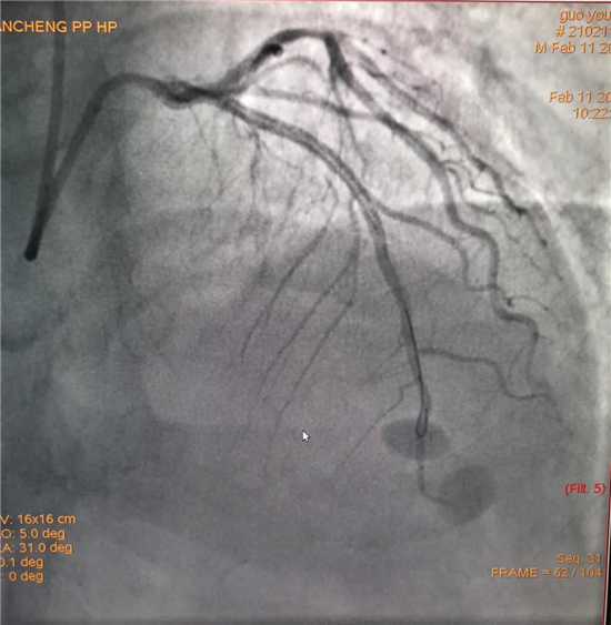 除夕,郭先生無明顯誘因突發(fā)胸痛,120急救人員到達現(xiàn)場,心電圖顯示:竇性心律完全性束支傳導阻滯。信息立刻發(fā)送到胸痛中心介入微信群中,心內(nèi)科值班醫(yī)生初步診斷為急性廣泛前壁心肌梗死,必須盡快進行急診支架治療,開通血管。值班醫(yī)生電話指導院前治療,并立即啟動胸痛綠色通道,24小時備班的介入治療團隊立即到位,9:30患者被送到導管室行冠脈介入診療,9:40急診PCI手術(shù)隨之開始,冠脈造影檢查提示左前降支閉塞,植入支架,堵塞的血管被順利打通,患者癥狀緩解,手術(shù)非常成功,10:20患者被送往病房進一步治療。